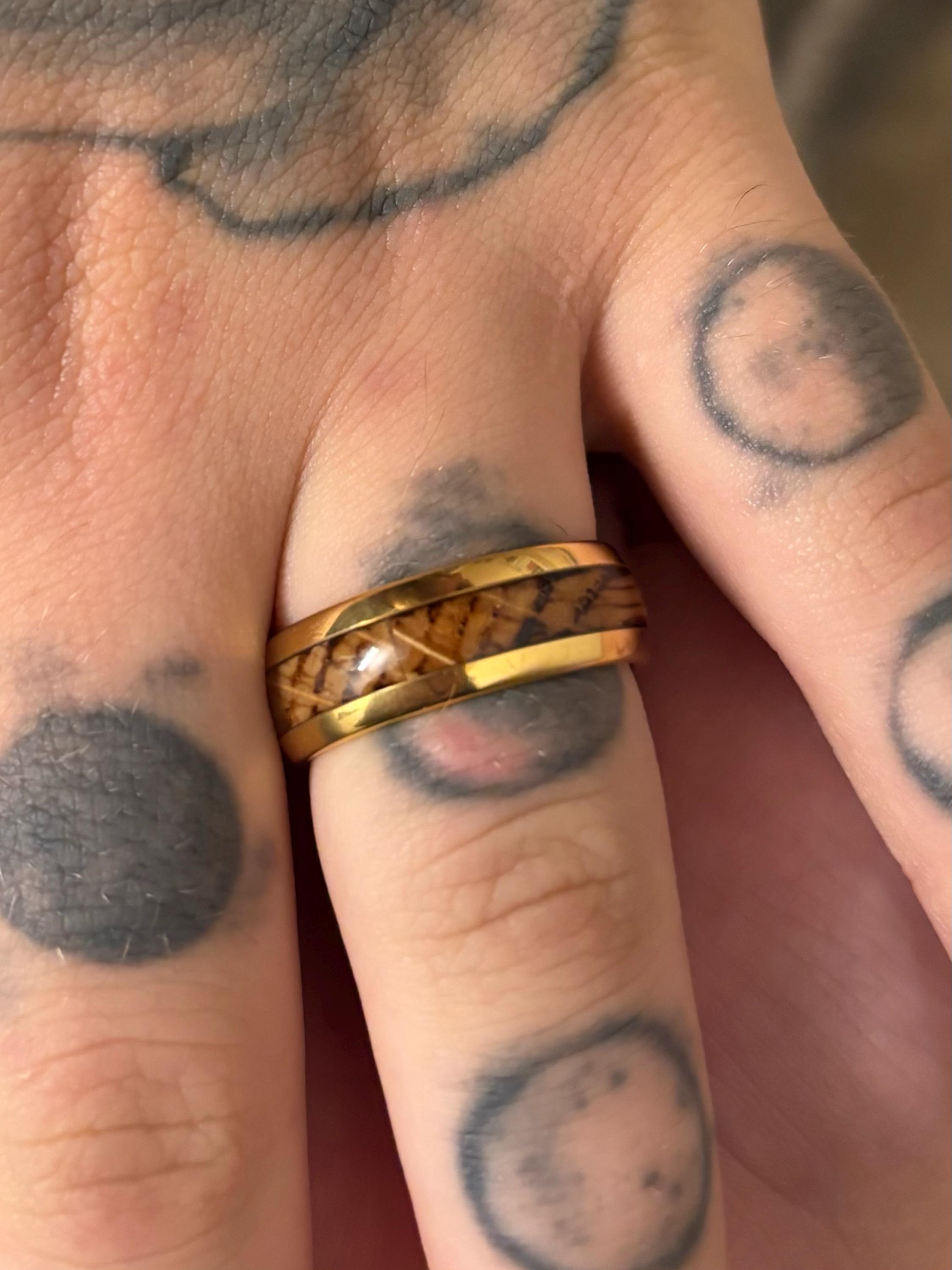 Introducing our 18k Gold Plated Tungsten Ring with whiskey bourbon wood inlay